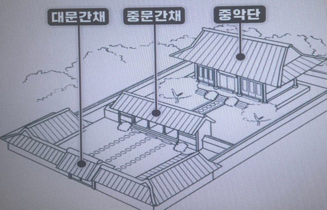 중악단의 대문간채와 중문간채는 삼문형식으로 가운데 문은 임금만 다닐 수 있는 어칸문으로 지붕도 높게 지었으며, 좌우의 문은 관료들이 출입하는 문이며, 지붕도 평평하게 지었다.