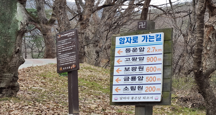 계룡산 신원사 전각배치도 1.대웅전 2.중악단 3.천수관음전 4.범종각 5.벽수선원 6.천왕문 7.노사나전 8.영원전 9.오층석탑 10.석탑 11.독성각 12.부도전 13.일주문 14.안내소 15.휴휴당 16.포대화상 17.명상쉼터 18.해우소 19.무량수각 20.매화당 21.종무소(일로향각) 22.선다원(불교용품) 23.소대 24.공양간(상락당) 25.공양간(세심당) 감로수각 약수대 주차장 안내문 풍순이와 고양이 신원사 안내문 신원사 암자로 가는 길 부도전입구에서 신원사 안내판이 있고 좌측은 신원사 경내로 들어가며,우측으로 암자와 탐방로 가는 길과 이정표가 있다.